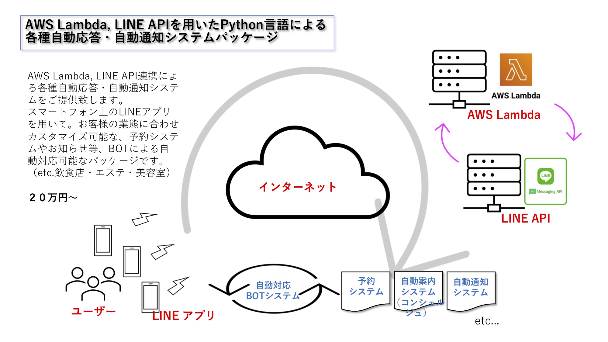 AWS Lambda, LINE API連携による各種自動応答・自動通知システムをご提供致します。