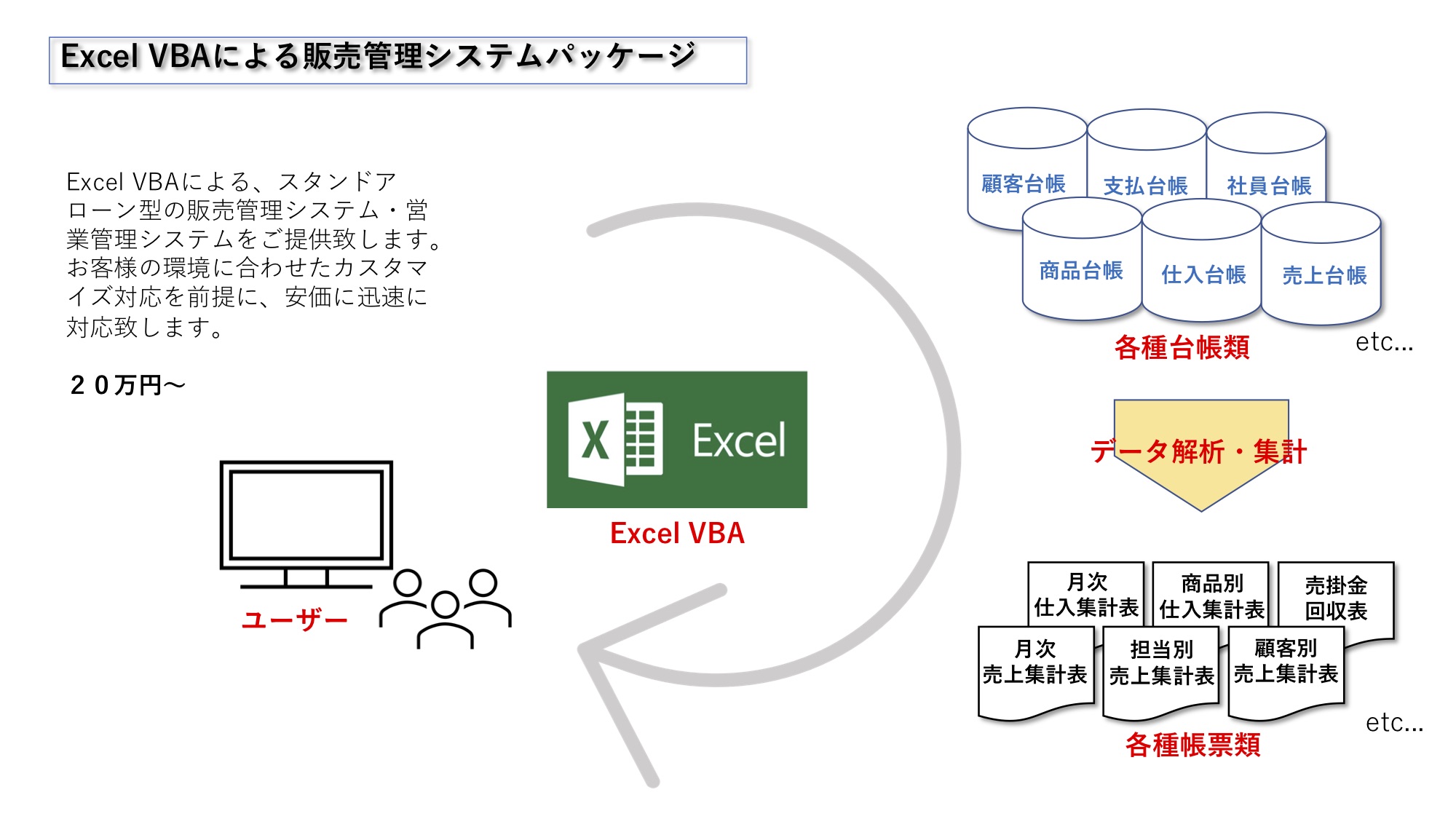 Excel VBAによる、スタンドアローン型の販売管理システム・営業管理システムをご提供致します。