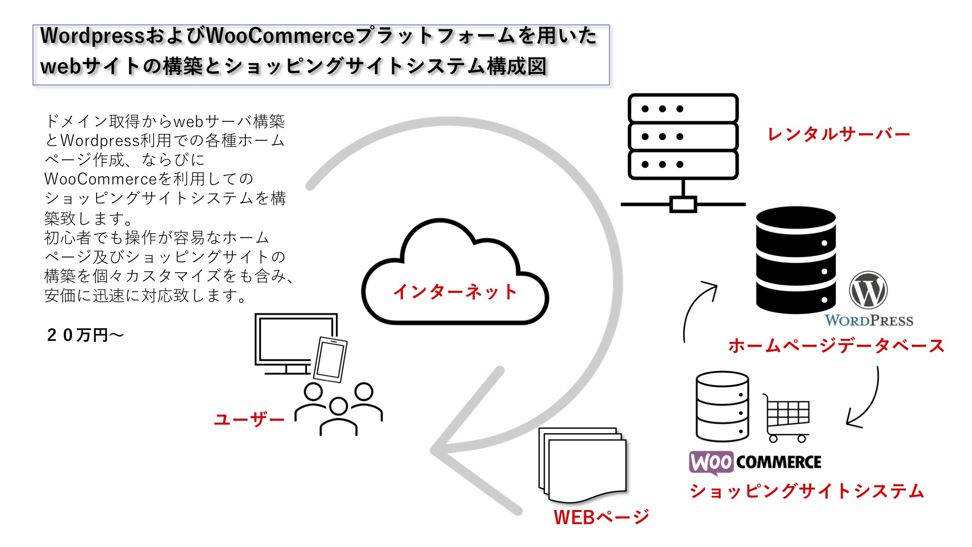 ドメイン取得からwebサーバ構築とWordpress利用での各種ホームページ作成、ならびにWooCommerceを利用してのショッピングサイトシステムを構築致します。